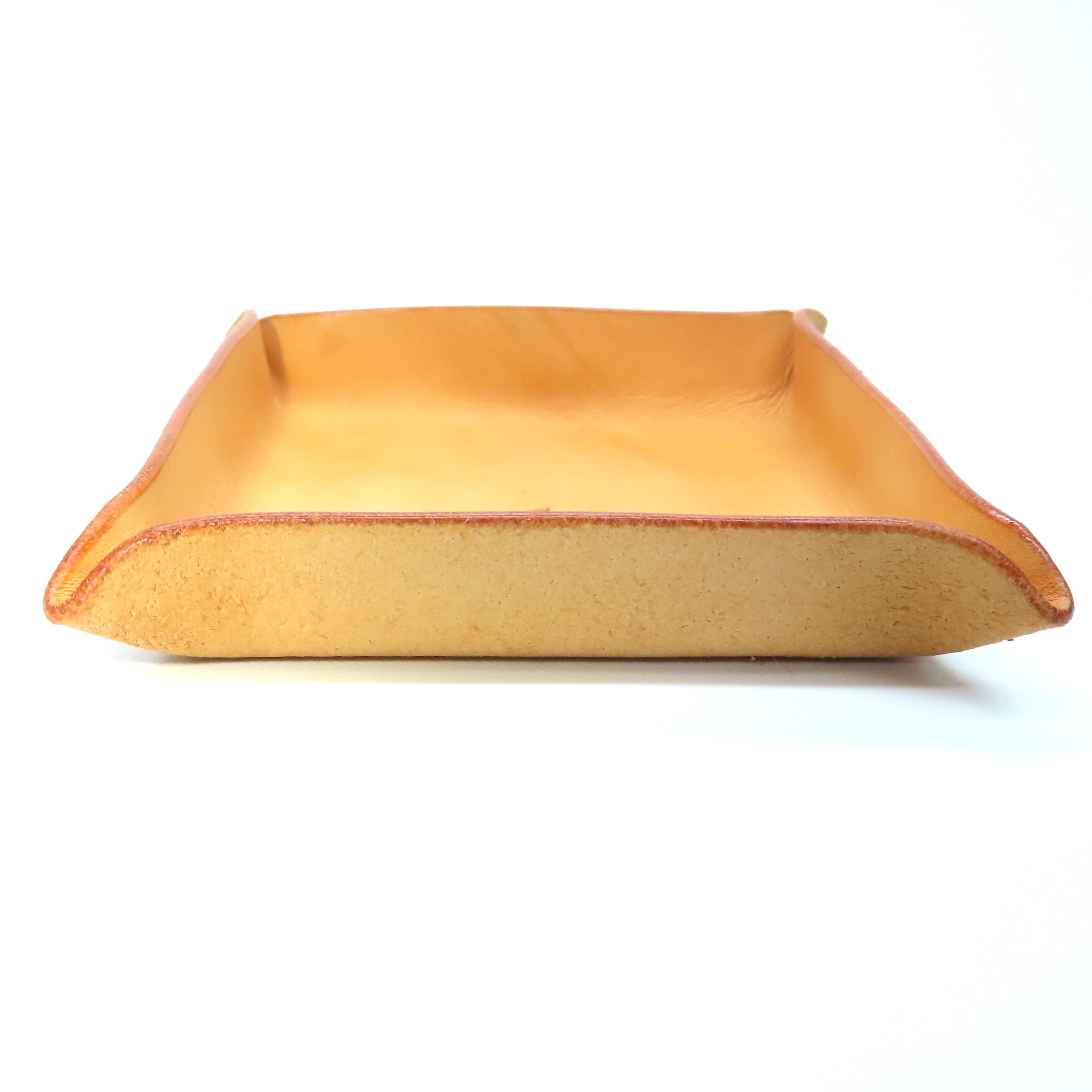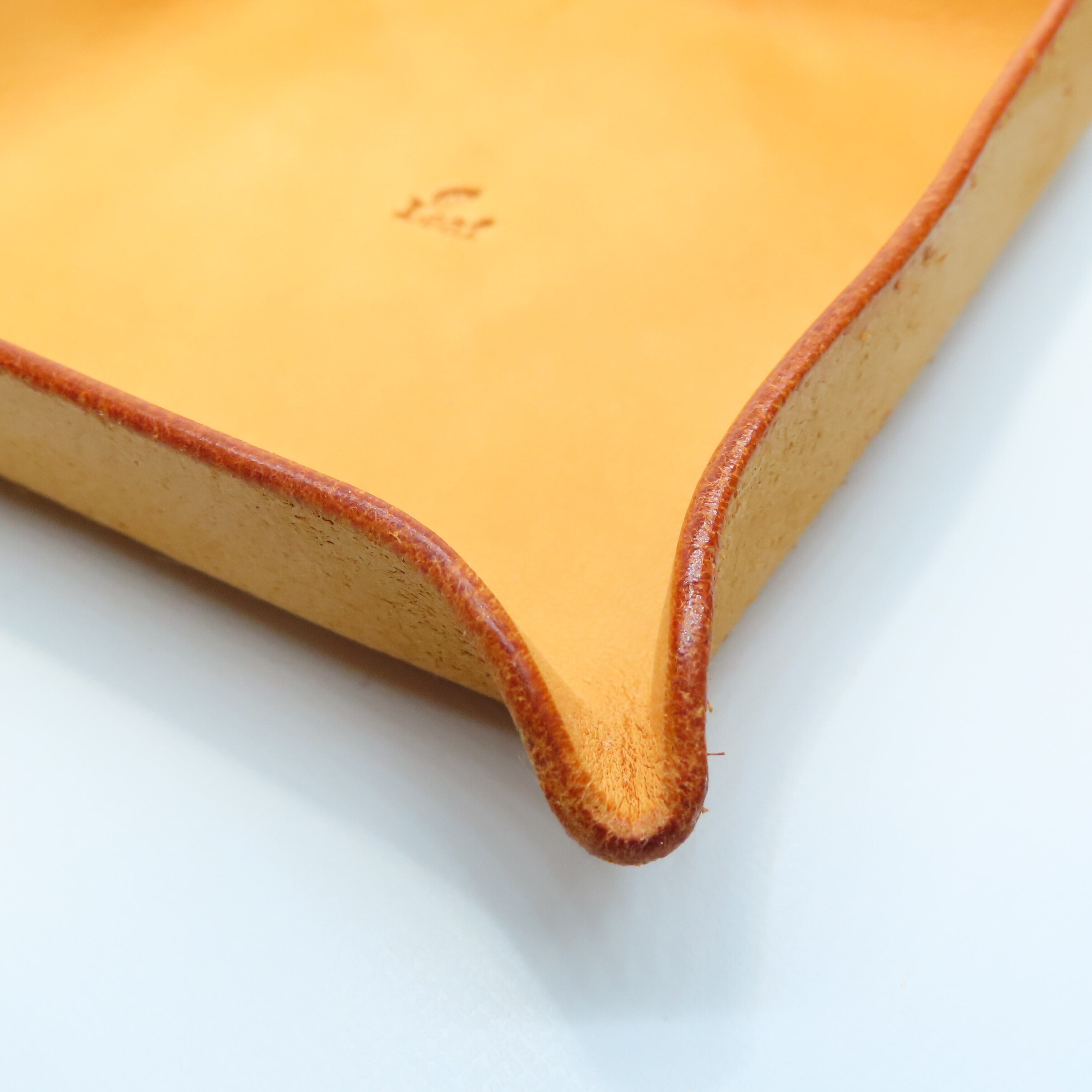 一枚のヌメ革を水で濡らし手作業で立体的に成型し乾燥させて作りました。いろいろな用途にお使いいただける小さなトレーです。